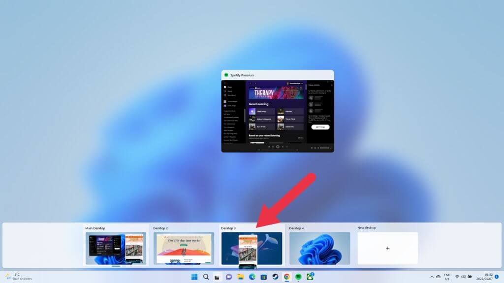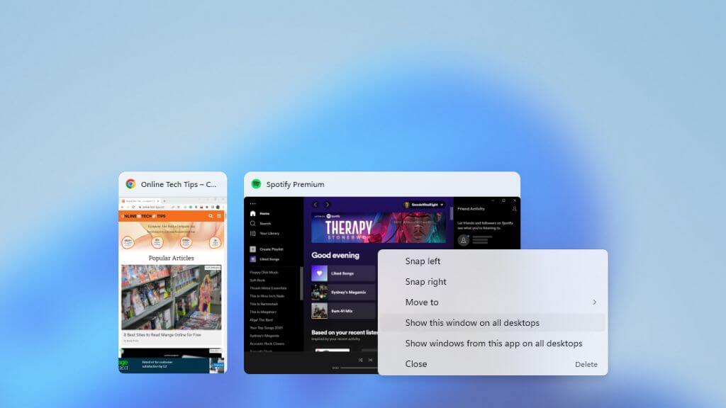 Usually, each desktop will have its own unique set of open apps and Windows, but sometimes you may want a particular app to be available on multiple desktops. A good example would be Spotify or your calendar app.