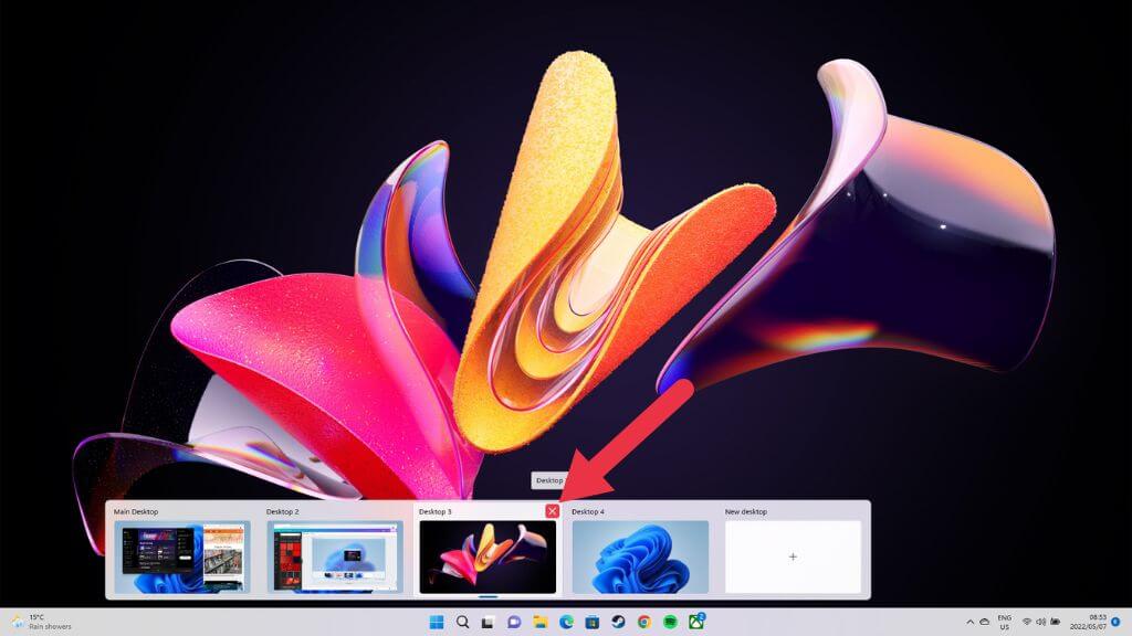 You don’t need to close or move the apps on a desktop that you want to close. When you close a virtual desktop, all of the open windows and apps on that desktop shift to the desktop one step earlier in the queue.