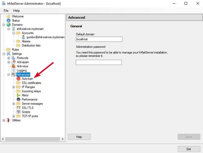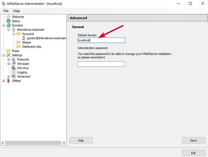 - Click Advanced and type in localhost under Default domain. Click Save.