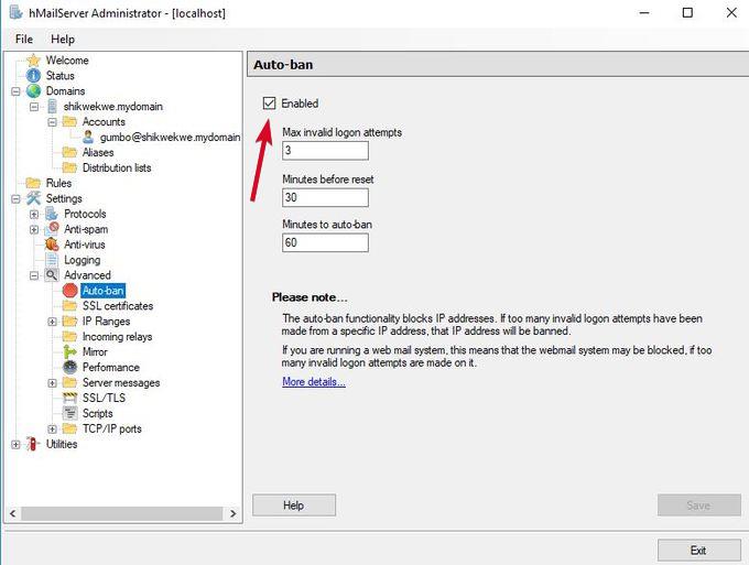 - Click the + next to Advanced to expand the list and then click Auto ban. This feature blocks IP addresses after several failed login attempts.