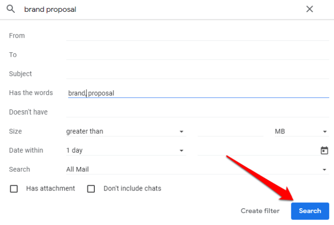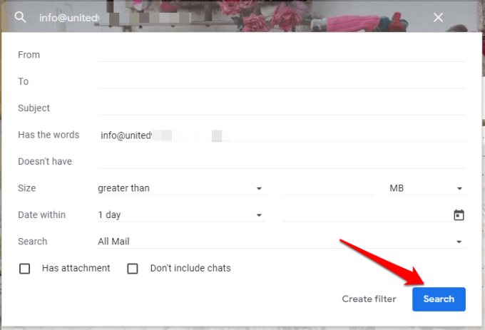 - You can use multiple search criteria by clicking the downward-facing arrow next to the search box. Next, paste the email address into the “From” field, or using the “Has the words” field for a more specific search with the name of the sender you’re looking for.