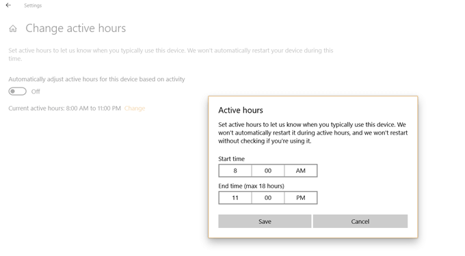 - Go to **Settings >**Update & Security > Windows Update > Change active hours.