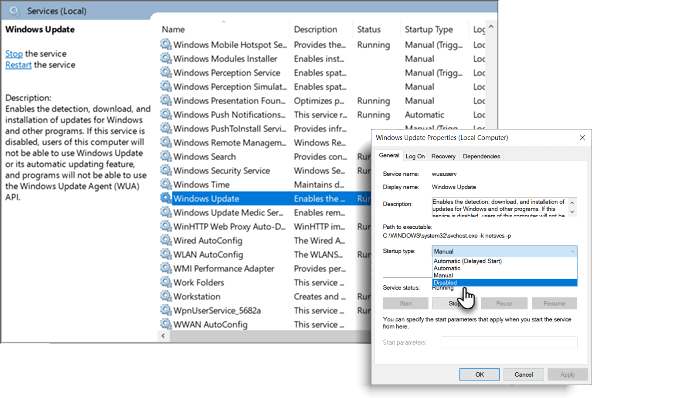 - In Startup type, select Disabled. Then click Apply and OK to save the settings.