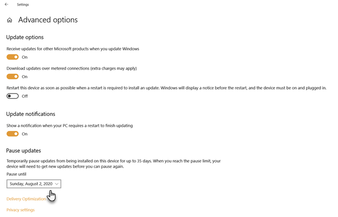 Note: In Windows 10 Pro, Education, or Enterprise, you can use Advanced Options to defer feature updates for up to 365 days (one year).