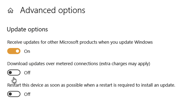 - Toggle off the Download updates over metered connections**(extra charge may apply)** setting.