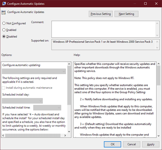 Select Disabled in Configured Automatic Updates on the left and click **Apply **and OK to disable the Windows automatic update feature.