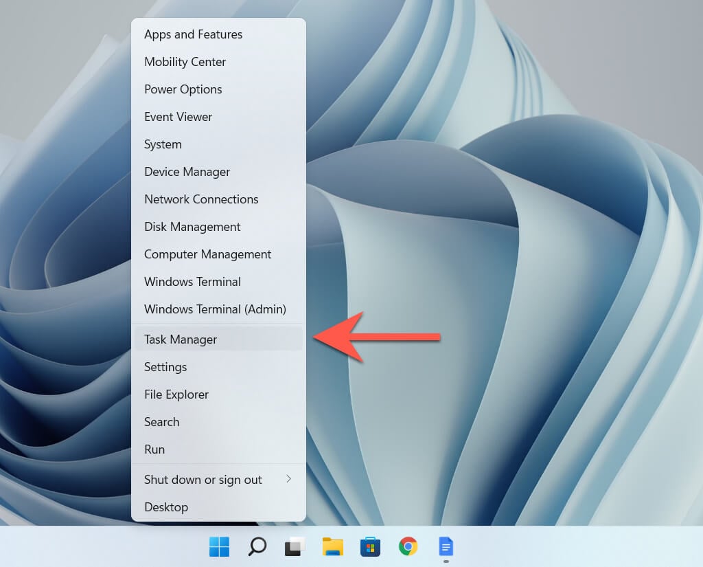 - Right-click the Start button and select Task Manager to open Task Manager.