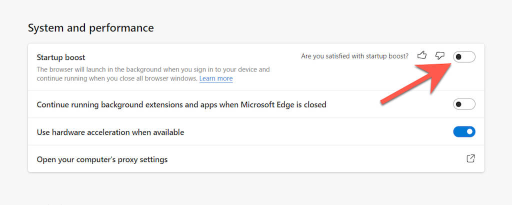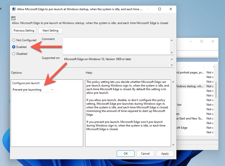 - Double-check the setting labeled Allow Microsoft Edge to pre-launch at Windows startup, when the system is idle, and each time Microsoft Edge is closed.