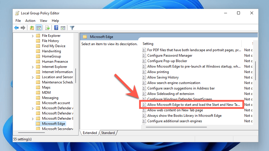 Locate and double-click Allow Microsoft Edge to start and load the Start and New Tab page at Windows startup and each time Microsoft Edge is closed.