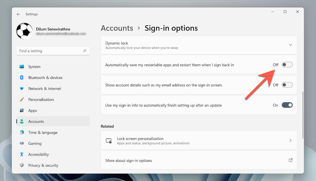 - Turn off the switch next to Automatically save my restartable apps when I sign out and restart them when I sign in.