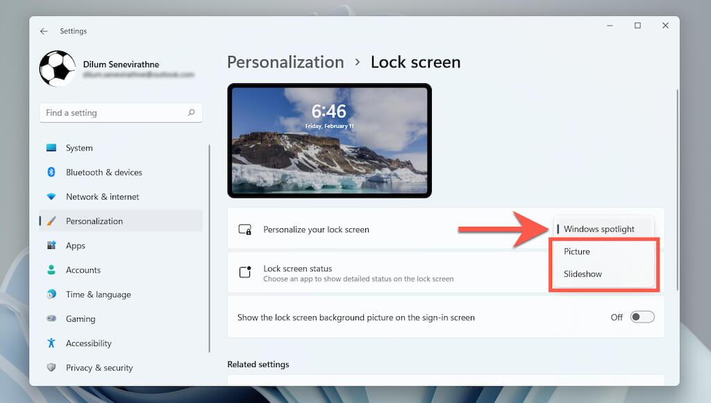 - Open the drop-down menu next to Personalize your lock screen and select Picture or Slideshow.