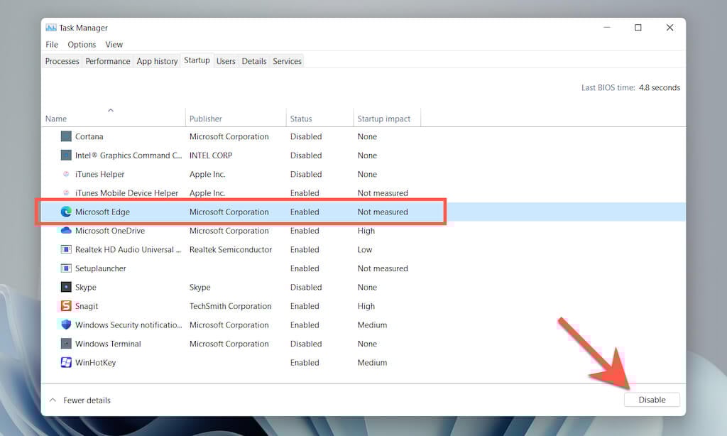 If the Microsoft Edge browser opens automatically soon after booting into the Windows 10/11 desktop, the chances are that it’s set up as a startup program on your computer. Disable it via the Task Manager.