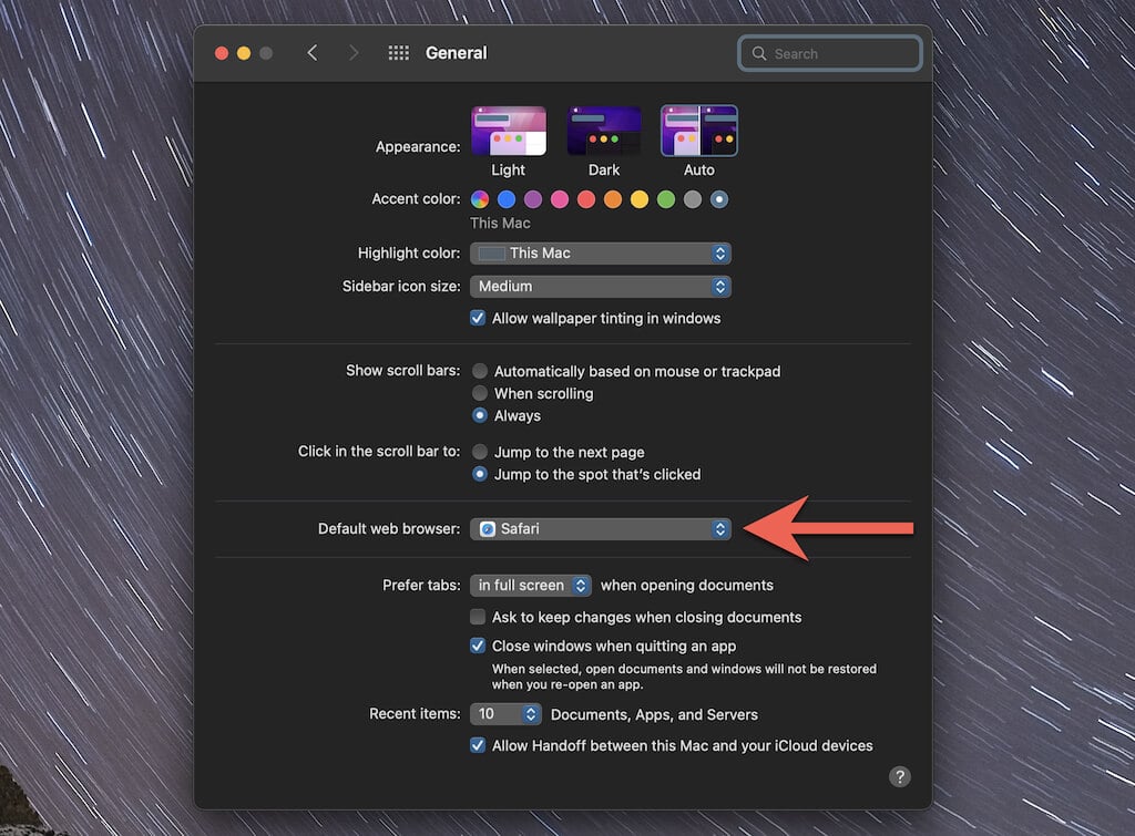 - Open the pull-down menu next to **Default web browser **and set another browser (e.g., Safari or Chrome) as the default.