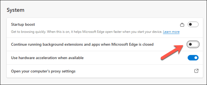 - In the Settings menu, press System and performance. * Locate the Continue running background extensions and apps when Microsoft Edge is closed setting and toggle the switch to the Off position.