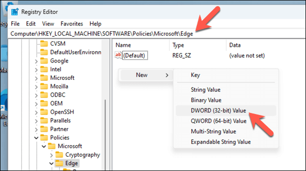- Use the navigation bar at the top or the tree menu on the left to navigate to this key: HKEY_LOCAL_MACHINESOFTWAREPoliciesMicrosoftEdge. * Look for a DWORD named AllowPrelaunch. If it doesn’t exist, you’ll need to create it. To do this, right-click in the right pane, select New > DWORD (32-bit)Value, and name it AllowPrelaunch.