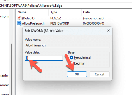 - Double-click AllowPrelaunch and set the Value data to 0 to prevent Edge from running at startup.