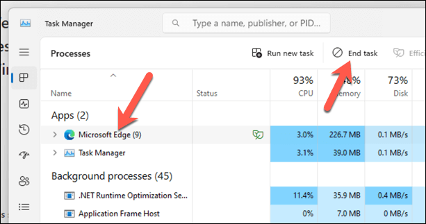 - In the Processes tab, look for any sign of Microsoft Edge. * Select the Microsoft Edge process to highlight it. In the top-right corner of the window, press End Task to terminate the process.