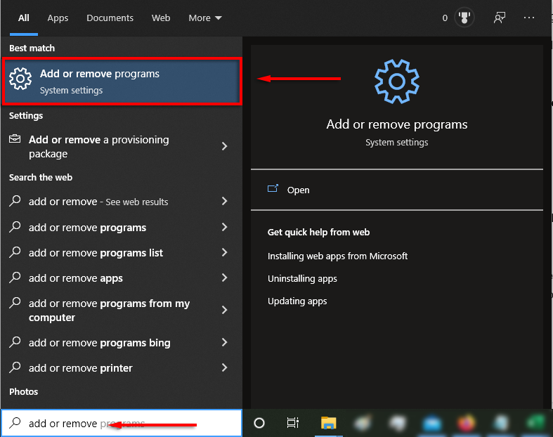 - Open the Start menu and type Add or remove.