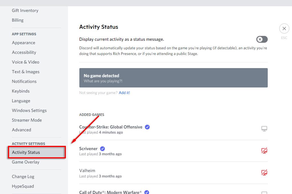 - Select **Activity Status** from the sidebar.