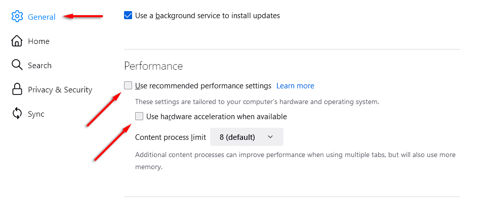 - Under the **General **tab, scroll down until you reach **Performance**. * Uncheck **Use recommended performance settings**, then uncheck **Use hardware acceleration when available**.