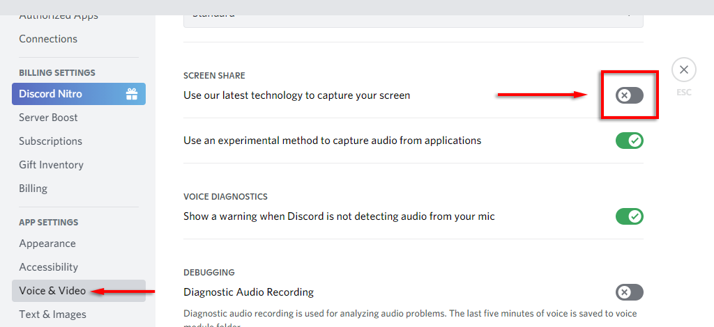 - Select **Voice & Video **from the sidebar. * Scroll down to **SCREEN SHARE **and toggle **Use our latest technology to capture your screen **off.