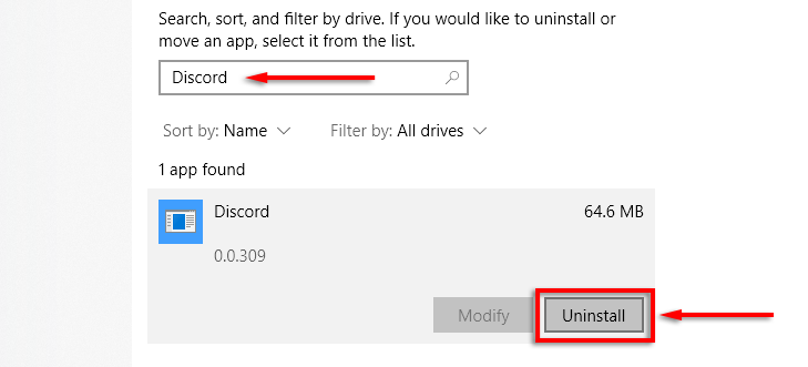 - In the list, find **Discord**. * Select Discord and then click **Uninstall**.