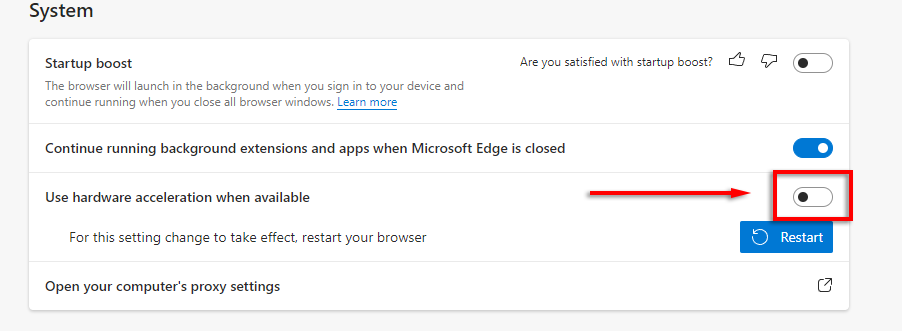 - In the sidebar, select **System**. * Under **System**, toggle off **Use hardware acceleration when available**.