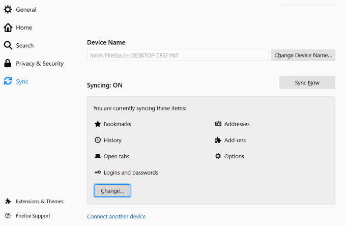If you want to remove a synchronized item, click on **Change **and uncheck what you don’t want to sync. To add a device, click on Connect another device to sync it in Firefox.
