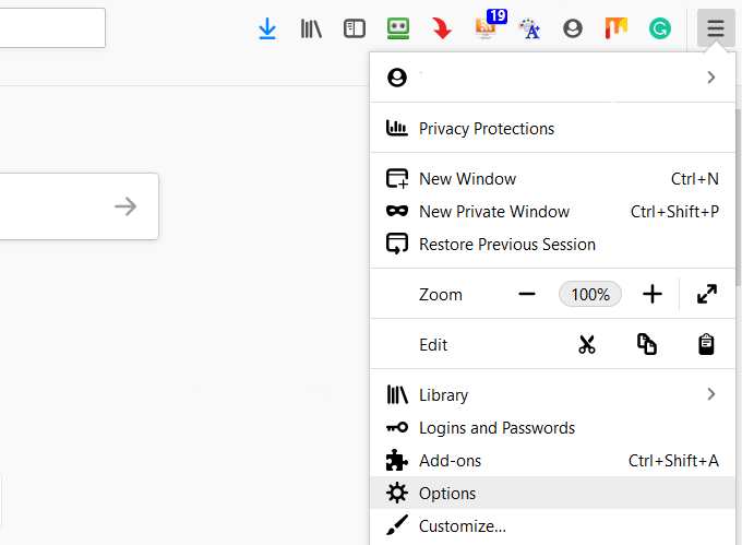 If you don’t already have a Firefox account, sign up for one. Next, open Firefox on your computer. Then click on the hamburger **Menu **button in the top right-hand corner > Options.
