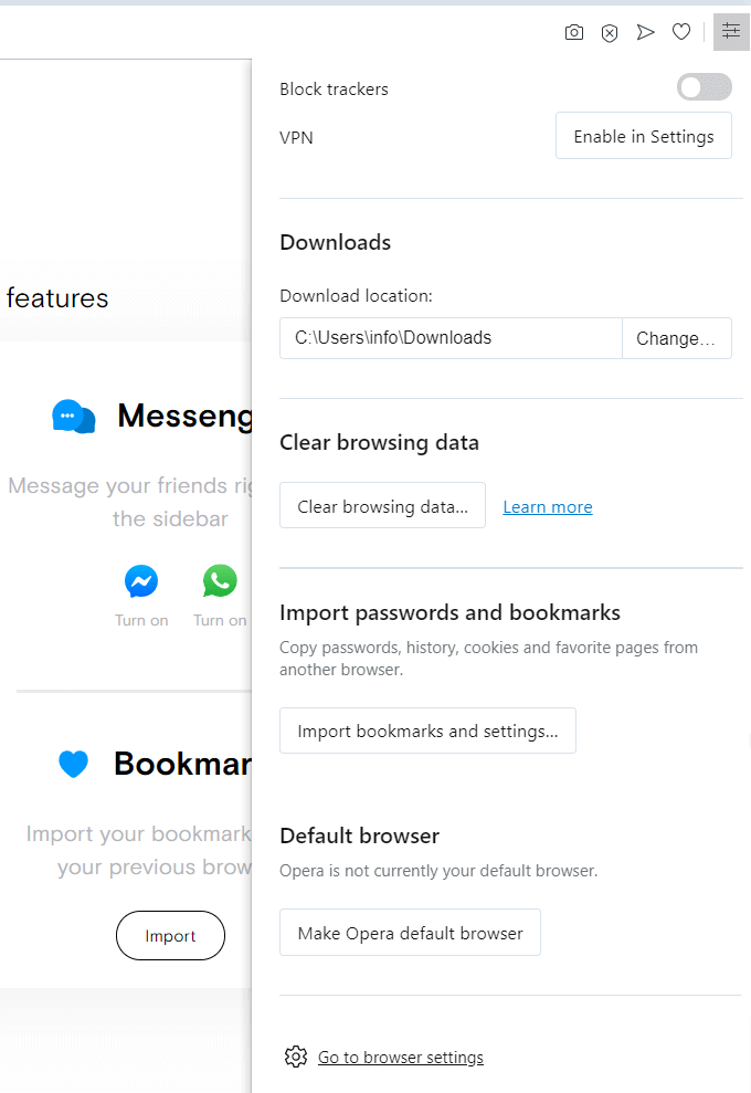 Sign in to Opera by going to **Settings **(for PC) and Preferences (for Mac) > Browser settings.
