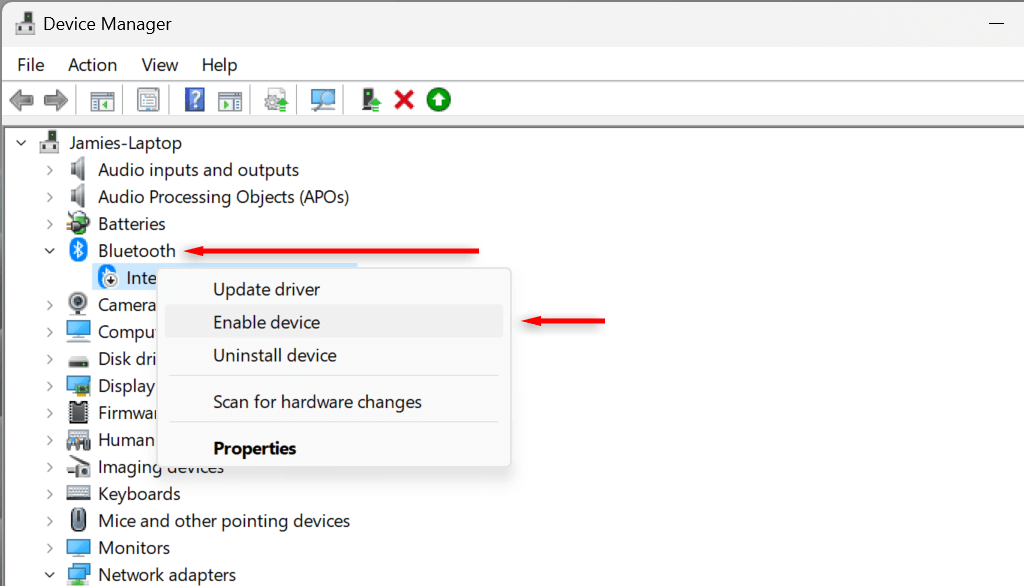 - Find the Bluetooth driver and select the arrow next to it to expand the section. * Look for your Bluetooth adapter. This will vary depending on your PC but will likely include the term Realtek, Broadcom, or Intel. * Right-click on the Bluetooth adapter and select Enable device. You should now be able to turn Bluetooth on in the Quick Settings menu or Windows Settings. If you can’t, try restarting your computer.