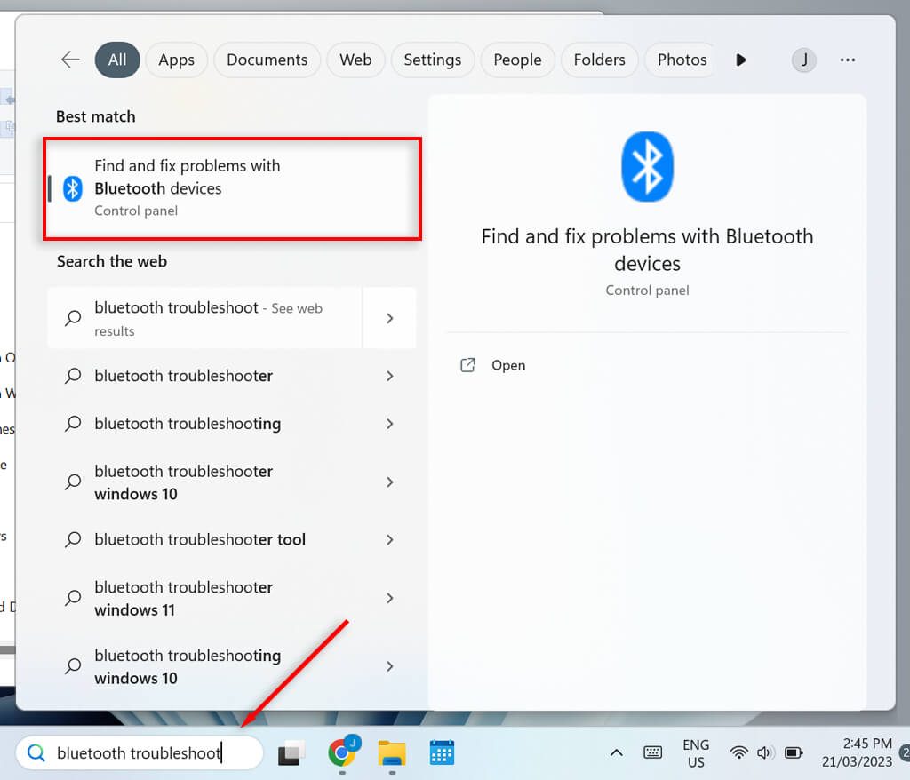 - In the Taskbar search bar, type Bluetooth troubleshoot.
