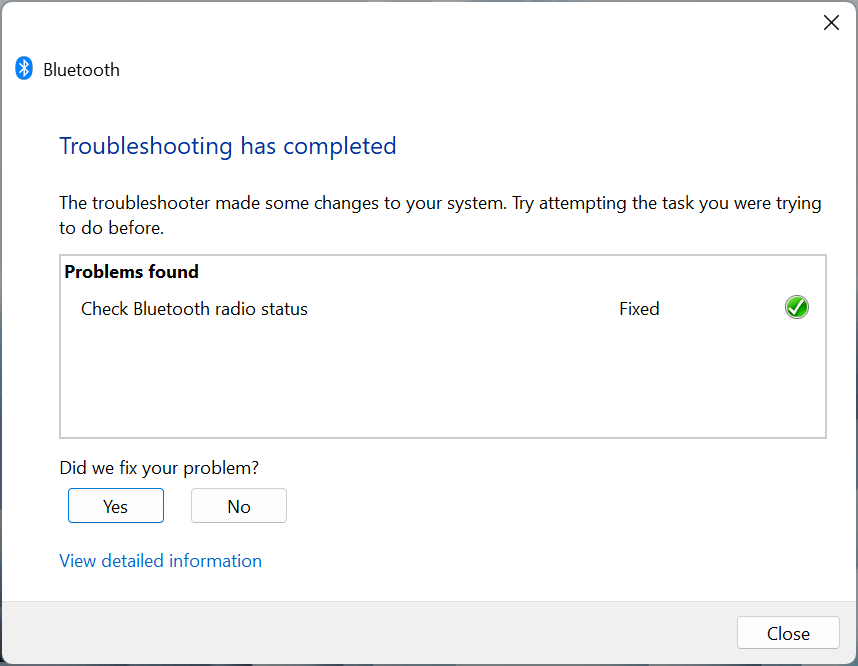 - If any problems are found the troubleshooter will either fix them or at least inform you of the issue. If the troubleshooter fixed your problem, select Yes, if not, select No.