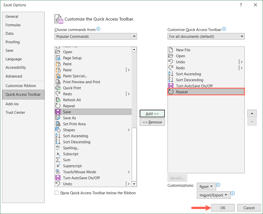 - In the first list to the right, select Repeat. Then, use the Add button in the center to move the action to the Quick Access Toolbar list on the right.