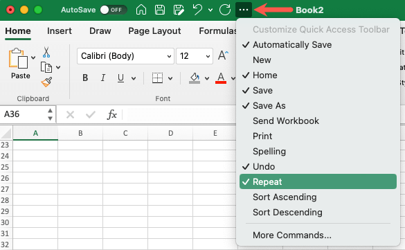 On Mac, you may not see the Repeat button in the Quick Access Toolbar but can enable it easily. Select the three dots to the right of the toolbar and pick Repeat in the list to place a checkmark next to it. You’ll then see it display in the toolbar.