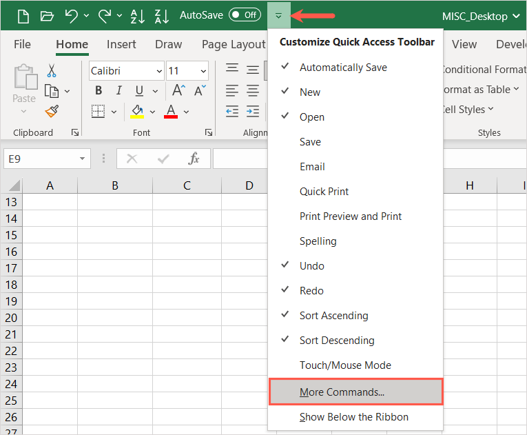 - Select the drop-down arrow to the right of the toolbar and pick More Commands or go to File > Options and choose Quick Access Toolbar on the left.
