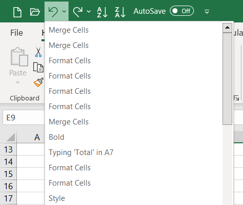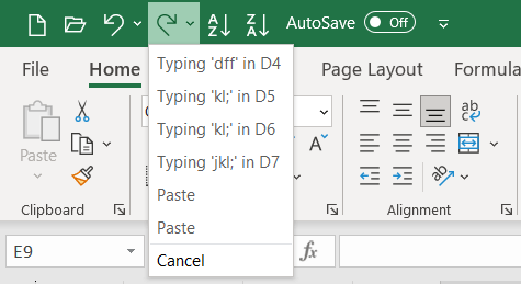 Note: There may be some actions that you cannot Undo in Excel, for example, saving a file. In these cases, the Undo icon will be grayed out and the tool tip will display as “Can’t Undo.”