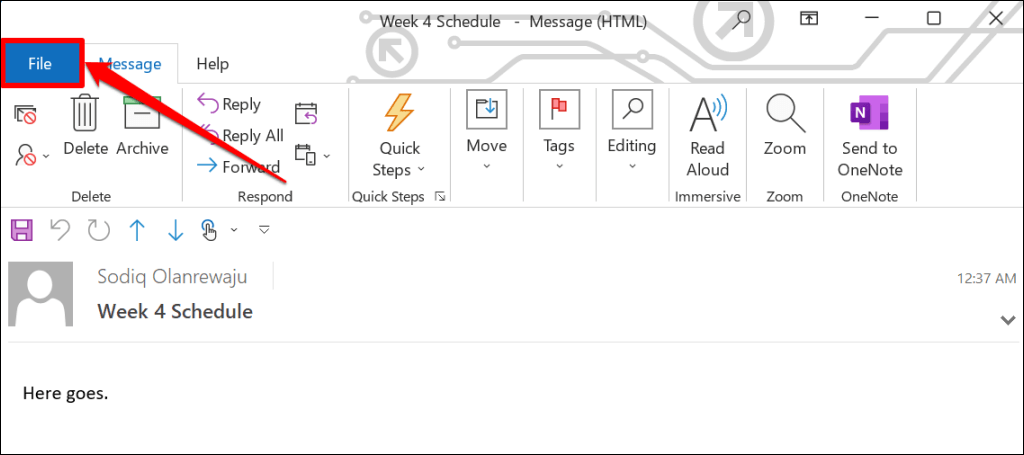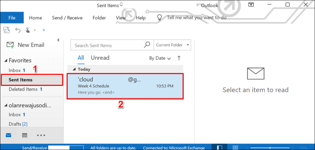 - Launch the Outlook app, open the Sent Items folder, and double-click the email you want to recall. Outlook will open the email in a new window.