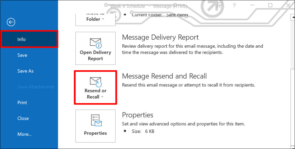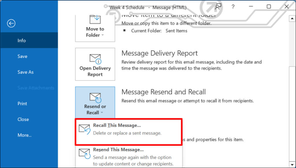 - Select Info on the sidebar, scroll to “Message Resend and Recall,” and open the Resend or Recall drop-down menu.