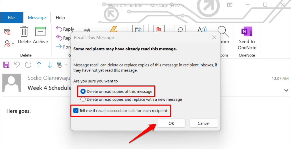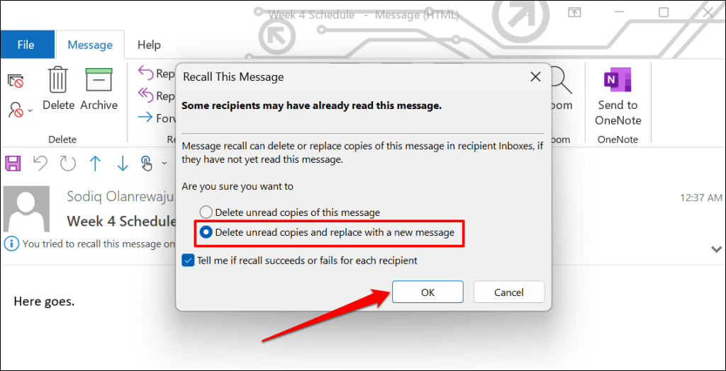 The “Delete unread copies and replace with a new message” option allows you to edit and resend an email. Microsoft then replaces the original email with the edited email in the recipient’s mailbox. This option is perfect for fixing typos and incorrect information in emails.