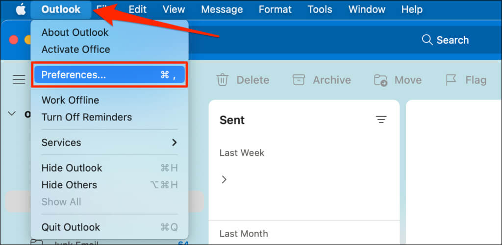 - Open Outlook, select Outlook on the menu bar, and choose Preferences.