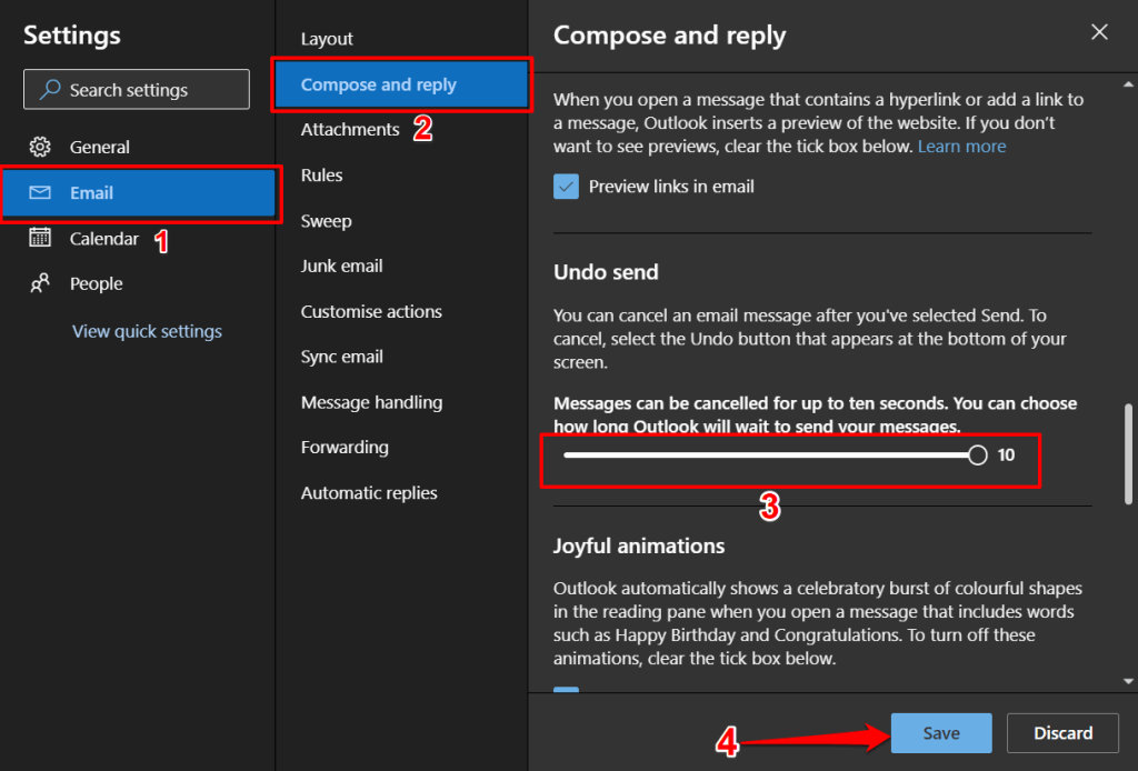 - Select Email on the sidebar, open the Compose and reply tab, and scroll to the “Undo send” section. Move the slider to select your preferred number of seconds (10 seconds max) and select Save.