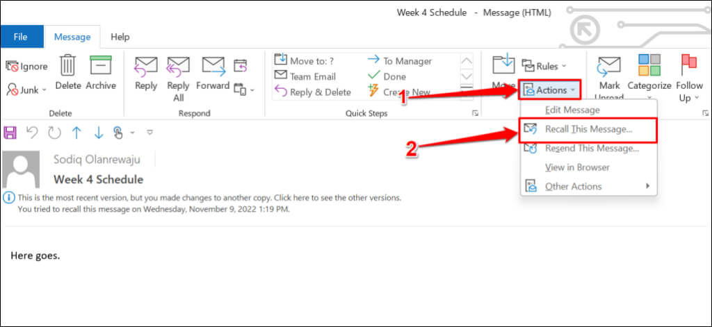 Alternatively, open the email, select Actions on the ribbon bar, and select Recall this Message.
