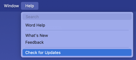 - Select Help in the menu bar and choose Check for Updates. If you don’t see this option, run the Microsoft AutoUpdate tool which you can grab from the Microsoft Support website.