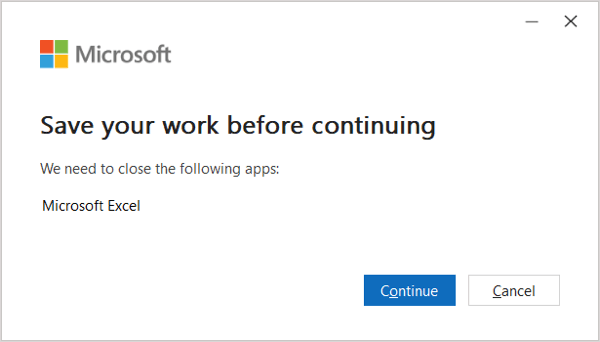 - You may then see a message that Microsoft must close your open Office applications to install the update(s). Be sure to save your work in these applications and then select Continue.