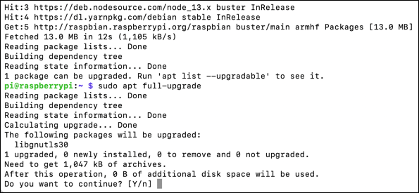 - Once your package lists are updated, type sudo apt full-upgrade and hit enter to update all installed software packages to the latest available versions.