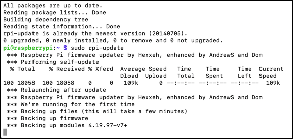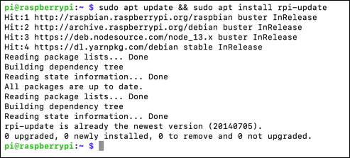 - If the latest version is installed, type sudo rpi-update to run the firmware updating tool, then hit enter. You’ll need to confirm whether or not you wish to proceed with the firmware upgrade by pressing the Y key on your keyboard.