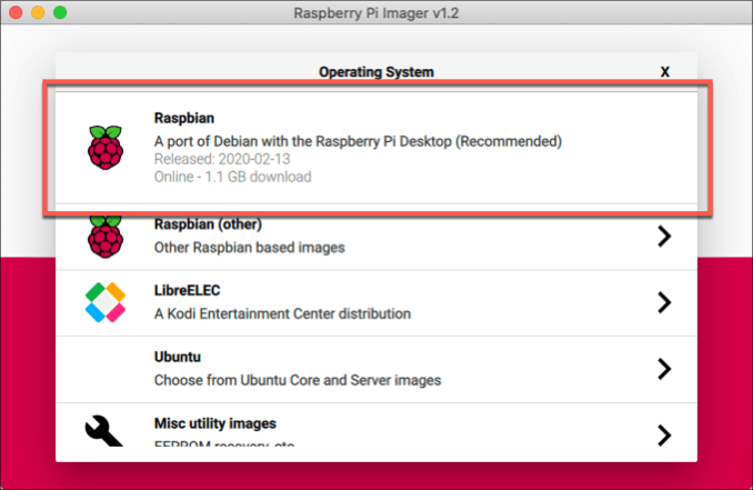 - Once the Raspberry Pi Imager tool is installed, remove your Raspberry Pi’s microSD card and connect it to your PC, then launch the Raspberry Pi Imager. In the Imager window, click the Choose OS button and select **Raspbian **from the option window.