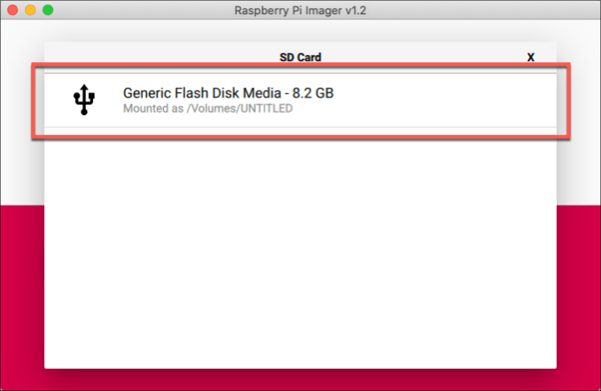 - With Rasbian selected, click the Choose SD Card button, then select your microSD card from the SD card selection menu.
