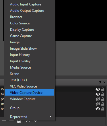 On OBS, click the **‘+’ **under the **Sources **box and select **‘Video Capture Device’ **option.